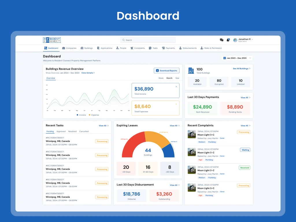 Resident Connect is a cloud-based Residential Management System catering to tenants, owners, property managers, and service providers. It offers comprehensive features like accounting, lease tracking, maintenance management, rent collection, and sale/lease listings. The platform also builds community and facilitates access to home services. We were expected to develop the entire application including feature implementation, secure data management, and enabling community building.